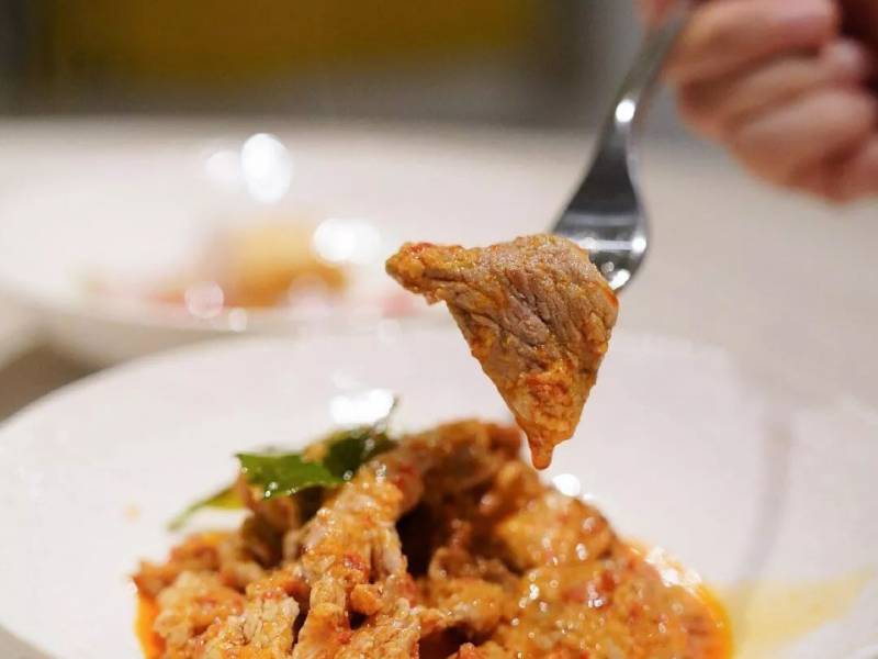其中,以沙爹酱为底,充满坚果香气,融合椰浆就变得像咖喱一样醇厚,猪肉片炒得恰到好处,也是一道下饭菜~