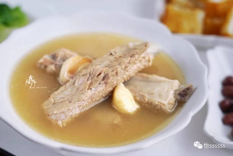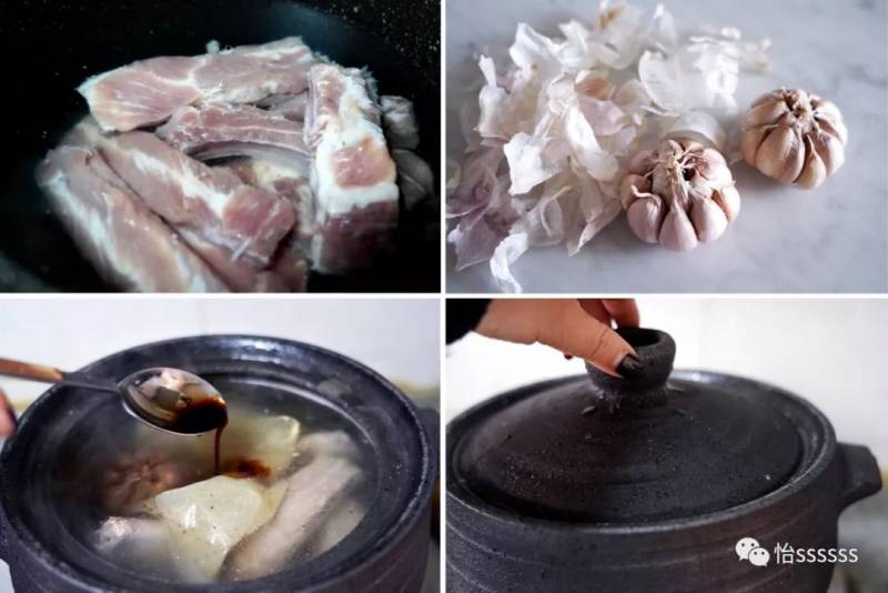 【3】炖锅里倒入足够的水(离锅边2cm免得扑,中途可以再加一次水),加入排骨、整颗的蒜、拍过的姜、肉骨茶料包、2勺生抽,煮沸后转小火炖两小时即可。