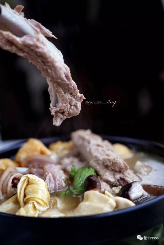 步骤跟上面做法差不多,只是猪蹄可以提前用高压锅压20分钟再和排骨一起炖煮,不然排骨软烂得没魂了猪蹄还没跟上节奏。其他配菜呢(豆节提前泡好),在起锅前十分钟下锅就行,生菜最后烫一分钟就好。丸子比我还多加了两勺老抽,汤汁更加浓郁。