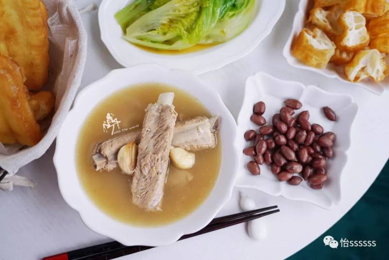 地道肉骨茶吃法,除了香米饭或油饭,一般还会配油条、花生、猪脚等,油条一定要蘸着汤汁吃。