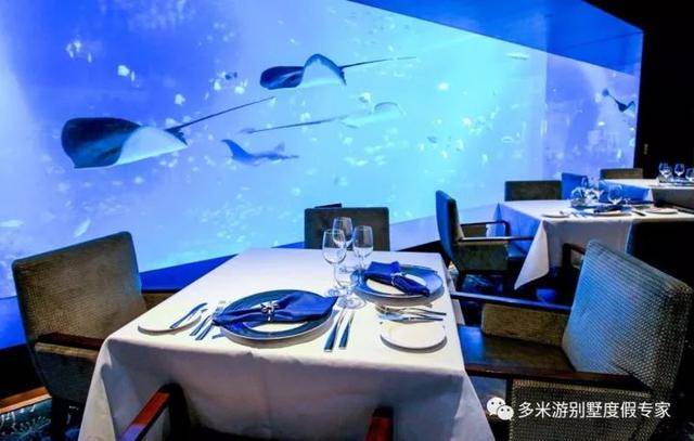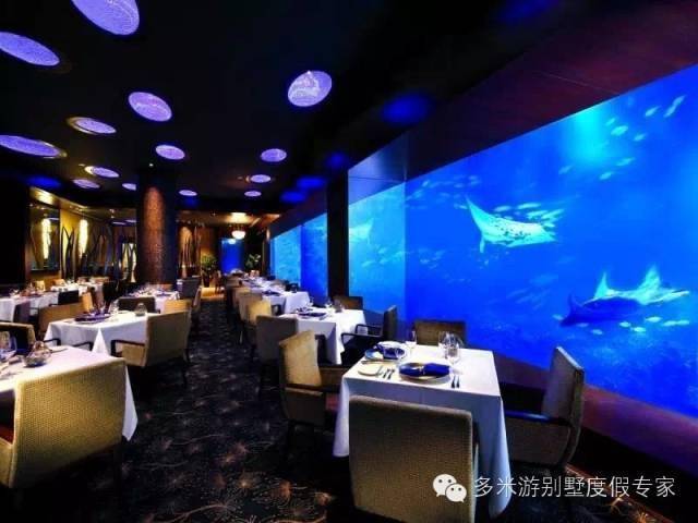 除了海景套房,在餐厅中也能与海洋生物亲密接触。如果有求婚的打算,畅游在海洋生物中的潜水员会很乐意助你一臂之力,给你的TA一个超级大的惊喜。
