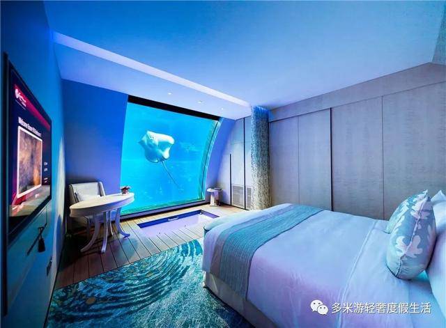 最浪漫的当属酒店全球限量11间的海底世界套房!卧室就是海洋景观房,按下床头的按钮,躺在床上就可以尽情欣赏海洋生物在此欢乐游戈~不知道你还睡得着吗?