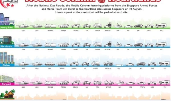 由超过60辆武装部队和内政团队车辆组成的机动部队,8月10日下午将从F1维修大楼出发,“兵分四路”向东、东北、北和西四个方向行驶,沿途经过各大邻里地标,预计傍晚6时45分到达五个庆祝活动现场。