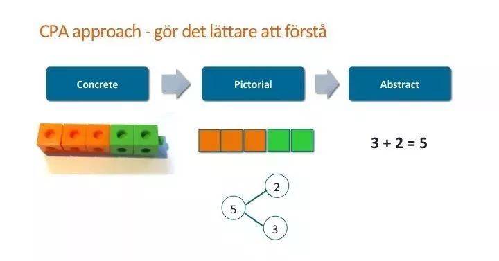 Concrete-Pictorial-Abstract(具体、图像、抽象)是一个重要的教学过程。小朋友会从具体情境开始学习,再以图像学习,最后才学习抽象概念。例如:
