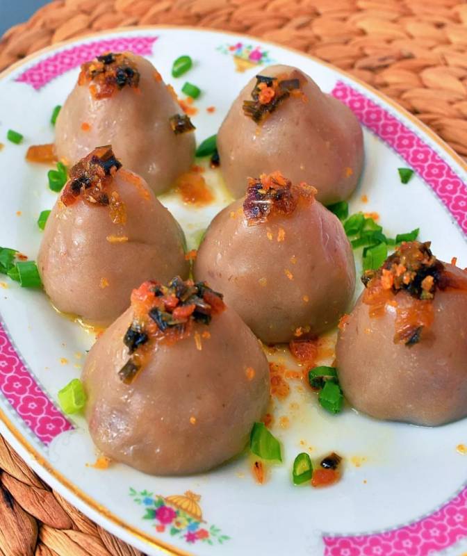 小巧的芋子包,皮嫩弹牙,馅料饱满,咸香可口。做法是将一公斤芋头蒸熟搅烂、加入500克薯粉搓成团后擀成皮,裹入肉碎、香菇、笋丝或沙葛、鱿鱼和扁鱼粉炒香的馅料。