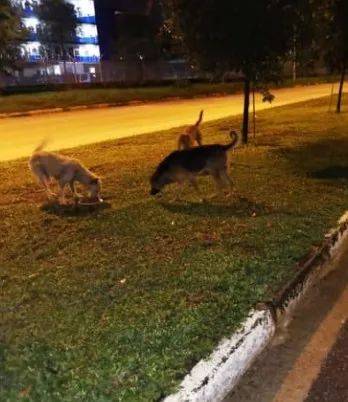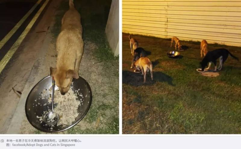 新加坡本地一名男子,在家门口看到了好几只浑身湿哒哒,还在发抖的流浪狗,专门回家煮了一大锅热腾腾的饭菜,用家里的盆盛出来,用来喂食那些流浪狗,刚开始只有两三只狗狗,但当他把饭菜放在外面的时候,又来了好几只,狗狗们都吃的香喷喷的。
