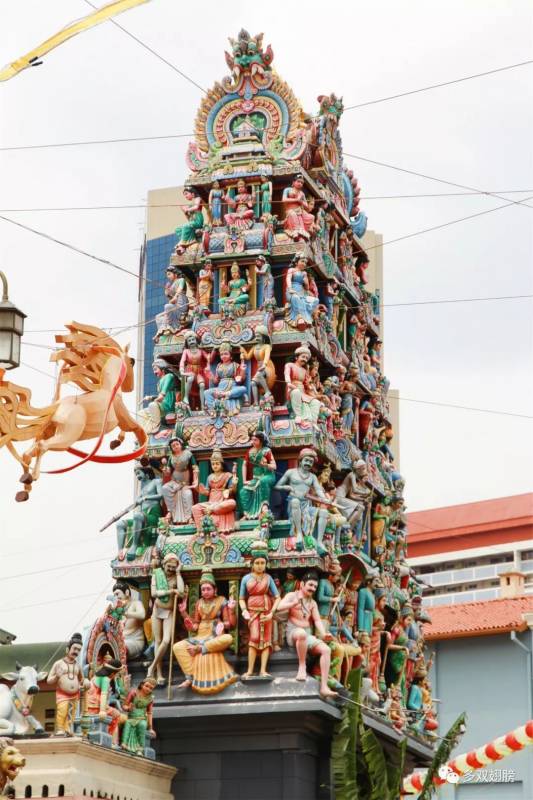 地铁蓝线或紫线乘到牛车水站,出门就是扑面而来的新年气息。路上还路过了印度教景点马里安曼兴都庙,不懂印度教的我们只能对这建筑啧啧称奇。