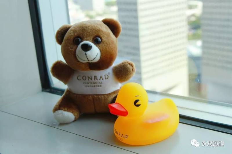 新加坡康莱德酒店在新达城边上,新达城是鸭子船的出发点,因此被Q的几率很高。康莱德属于希尔顿旗下的高端品牌,房间精致,服务到位,酒店为入住孩子赠送的小熊也小鸭子我们至今都珍藏着,当年讲话讲不令清的多多小朋友认为这枚小熊是只小花栗鼠,他的发音是“xiao hua ni sou”。