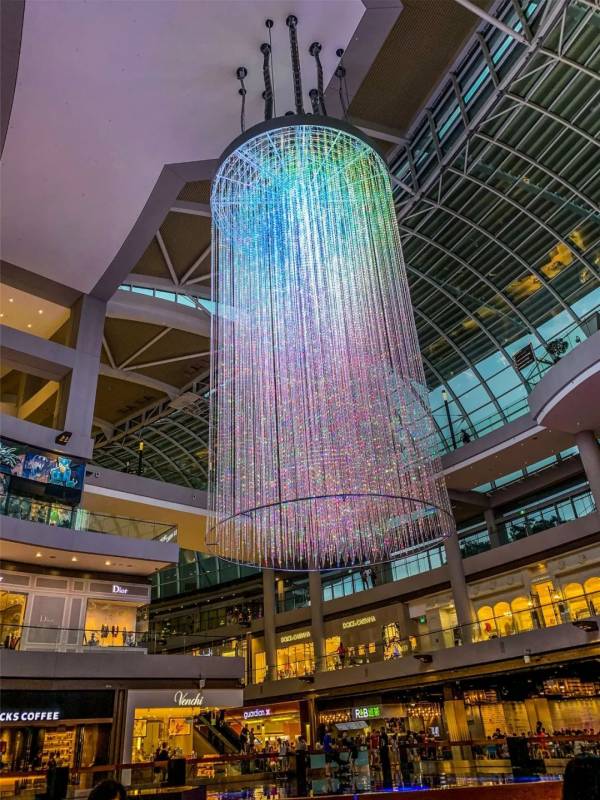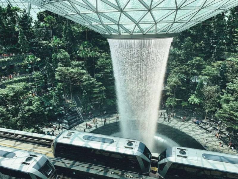 这个商场最著名的莫过于这个全球最大的室内瀑布。瀑布高40米,周围坐落着2000多颗树木,和10万多颗灌木,把整个商场打造成了森林。连接各航站楼的捷运车辆会从瀑布旁穿越。