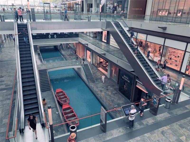 地下则是用玻璃把瀑布的水流和商场进行了隔离,可以从上中下三种不同的视角对这个市内瀑布进行欣赏,这个设计非常独特。