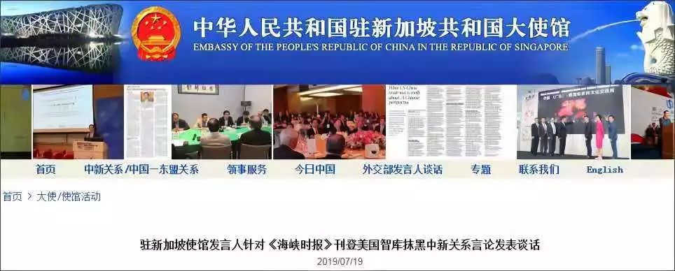 7月19日,驻新加坡使馆发言人针对《海峡时报》刊登《报告显示中国如何在新加坡进行影响力操作》发表谈话,内容如下:7月18日,《海峡时报》刊登《报告显示中国如何在新加坡进行影响力操作》(Report flags how China conducts influence operations in Singapore)的报道,引述美国詹姆斯敦基金会近日发表的一份报告,诬称中国利用统战手段,通过新加坡商会、宗乡会馆、文化组织和华文媒体等不同渠道对新加坡华人施加影响,引导社会舆论和政策走向。