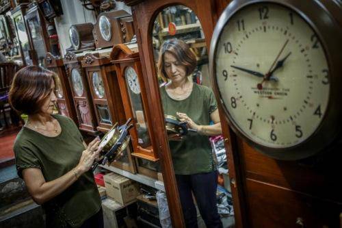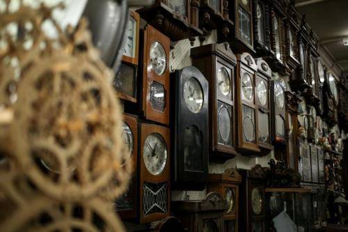 店里悬挂的古董锺都是还未修好的。这些时钟来自世界各地的不同时区,封存着从1770到1960年代就停摆的时间。(新加坡《联合早报》/叶振忠 摄)