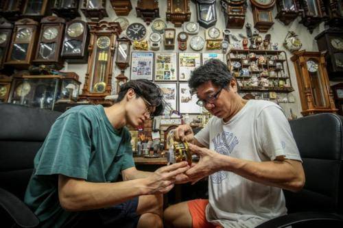 三代时间工匠,一棒接一棒,用亲情坚守修理古董钟的手艺。(新加坡《联合早报》/叶振忠 摄)