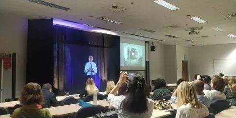 在 FOME 会议期间,来自英国的特邀发言者提供了全息技术。这种全息图是由洛杉矶 ARHT 传媒公司开发,其设计目的是使学者和客座演讲者能够通过全息图连结向学生实时展示,无需本人亲自到场。该技术将使商学院有望同时在多个班级和地点举办讲座,以及由真人和虚拟演讲者共同出席的讨论小组和活动。