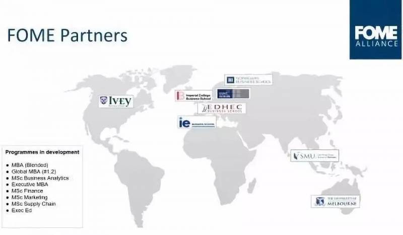 FOME 联盟由 SMU 李光前商学院( LKCSB )、帝国理工学院商学院(英国)、柏林ESMT商学院(德国)、BI 挪威商学院(挪威)、EDHEC 商学院(法国)、IE 商学院(西班牙)、墨尔本大学(澳大利亚)和 Ivey 商学院(加拿大)组成。FOME 联盟的建立基于大家的共同愿景,即在线学习应该与最好的面对面课程具有同样的变革影响。新加坡管理大学和其他七所商学院积极合作,通过共享学习平台,将教师的专业知识和前沿技术结合起来,为世界各地的学生提供现代化、高质量的在线课程和学位课程。