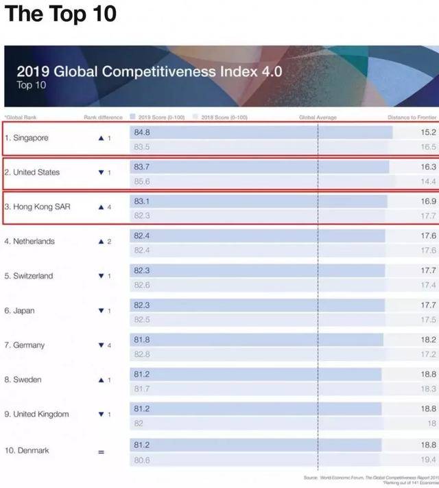 该指数通过12项支柱下的103项指标,对141个经济体的竞争力状况进行分析。每项指标采取0-100分的计分制度,展示一个经济体距离理想状态或者“满分”竞争力之间的差距。新加坡在满分为100分的这一指数体系中总分为84.8,位列榜首;美国紧随其后,得分83.7;香港排名第三,得分83.1。
