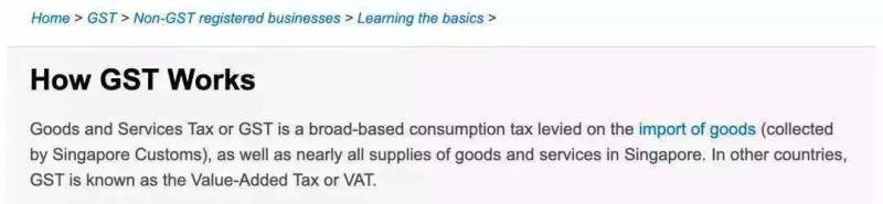 商品和服务税(GST)是对商品进口(由新加坡海关征收)以及新加坡几乎所有商品和服务征收的基础广泛的消费税。在其他国家/地区,GST被称为增值税或VAT。