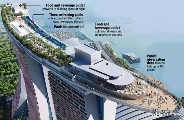 在这片广阔的空中花园内,设有餐厅、酒吧、咖啡馆和无边泳池,以及能够 360 度全视角观赏新加坡天际线及四周粼粼水波的观景台。