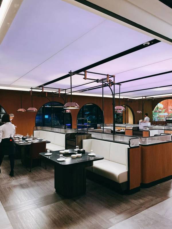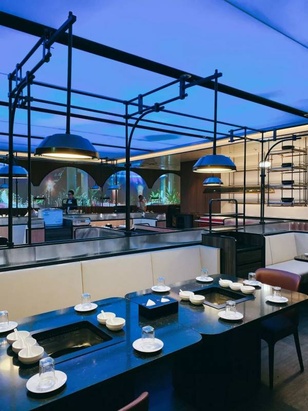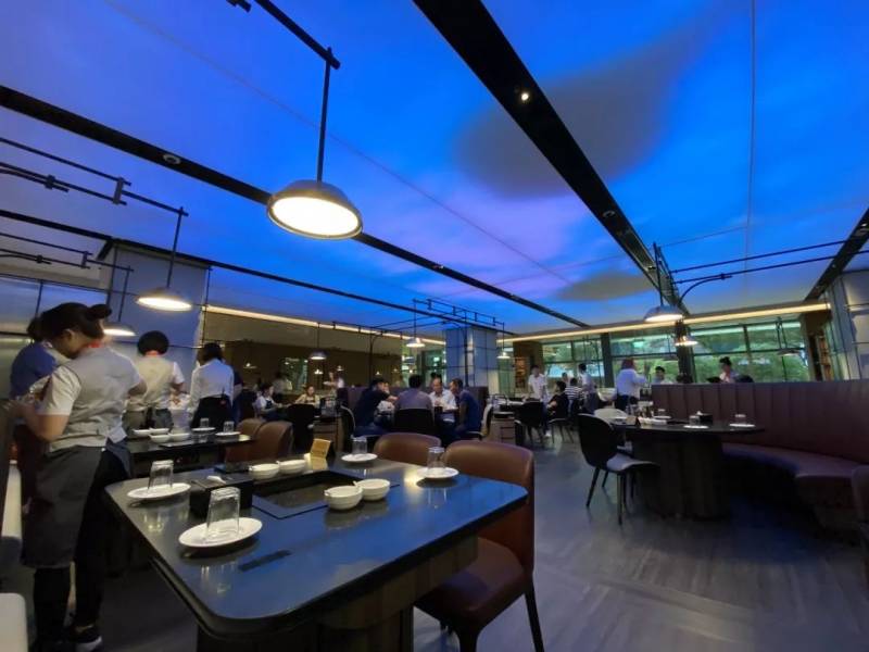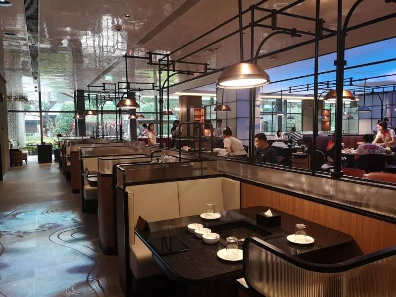 冷酷的钢管设计,给新店注入了工业风元素,深色的装修色调,给新店更是提升了格调,显得更加高端,看起来更像是海底捞新加坡旗舰店了。