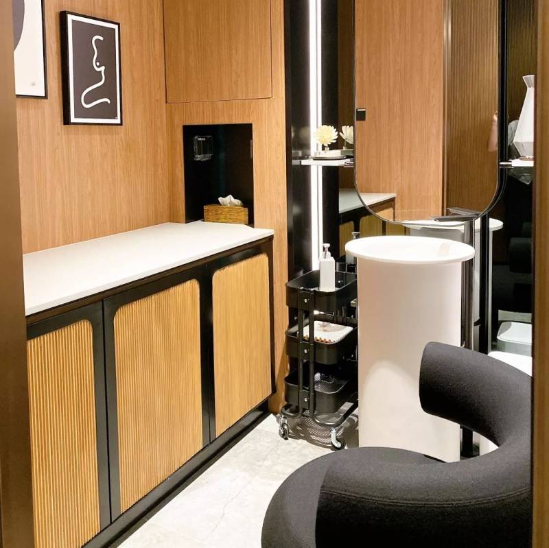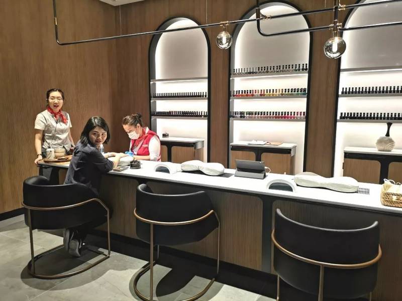 新店的美甲室和外部装修是一致的硬朗风格,其实更建议添加一些粉色的元素,例如门外的粉红色圣诞树,更适合放在美甲室。工作人员告诉我们,这间美甲室新加入了手部护理,男士们也是可以来做手部护理,保养一下。