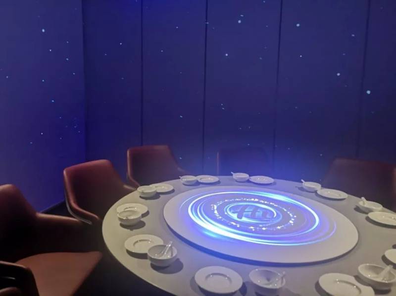 进入包房,我们感觉自己进入了奥秘的宇宙,墙壁上的繁星点点,和餐桌上的圆形幕板,给我们展示了一场生动的灯光投影秀。