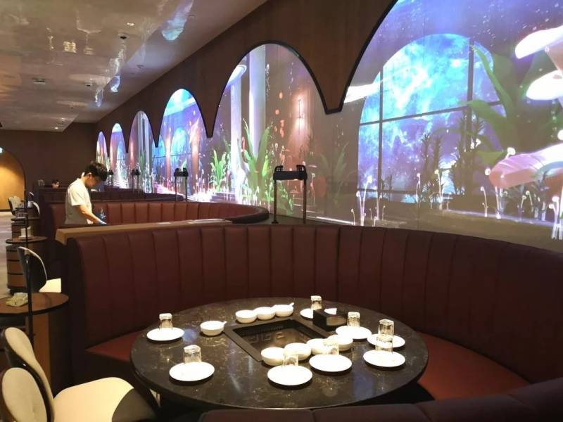 利用全息投影打造了一个裸眼3D效果。墙壁是用的高清投影来布置的,结合四种不同特效无间隙的播放。时而置身海洋世界,时而身处森林深处,营造了一个让顾客从味觉、嗅觉、听觉和视觉全方位、沉浸式的用餐体验。为了让顾客有个更好的用餐环境,海底捞也是煞费苦心了。