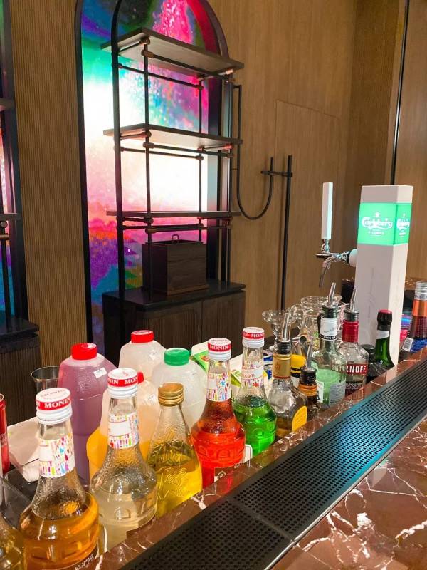 有专门的调酒师在吧台调酒,可以在菜单上点,送去餐桌喝,也可以单独在吧台附近喝。