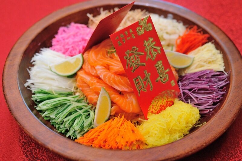新加坡人过年要要捞鱼生的,就是一大盘含有生鱼片的杂拌,包括胡萝卜丝、白萝卜丝、蜂蜜、炸面片、芹菜丝,柚子肉,诸如此类的东西,少则七八种,多则十几种,每种都有一个很好听的名字,比如甜甜蜜蜜,遍地黄金,然后一包包的放进去,然后大家一起搅拌。搅拌均匀后,一边喊吉利话一边把鱼生高高捞起,通常会撒得满桌都是。捞够了,就开始吃。说真的,味道不大好,就图个热闹。