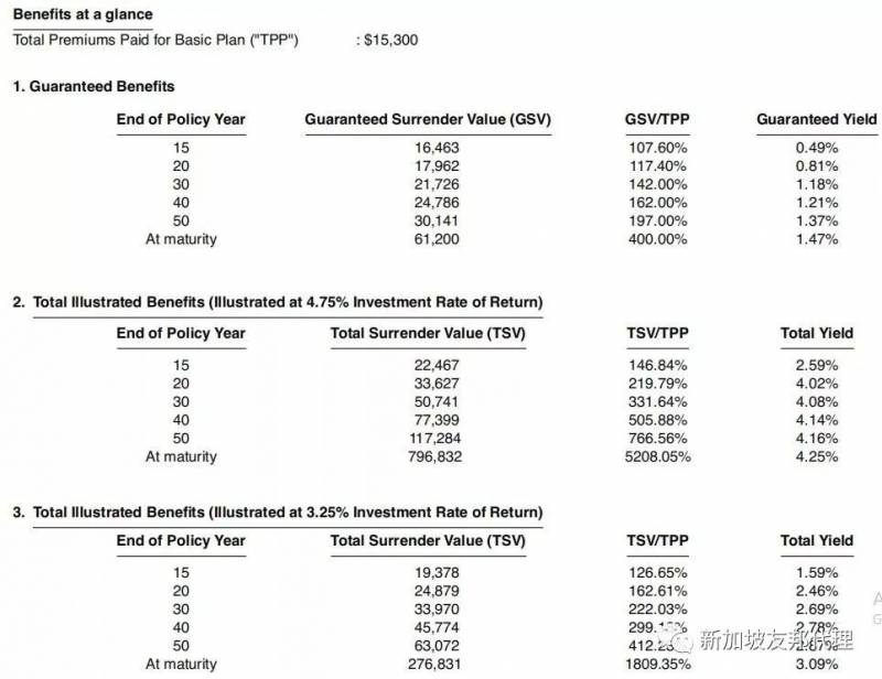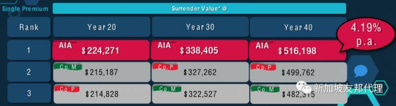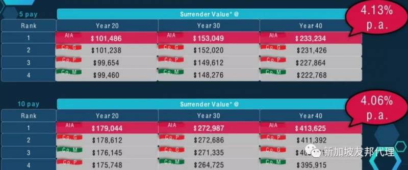 上图1,2,3分别是保证在各个保单年的保证价值、在假设4.75%及3.25%投资回报时的总保单价值,即你退保可以拿到的钱。接下来放几张各个公司同产品对比,一目了然。举例子,假设你单笔缴费15300新币,在4.75%投资回报时(第2条),第20年的回报为33627新币,年化是4.02%,新加坡同类产品最高。