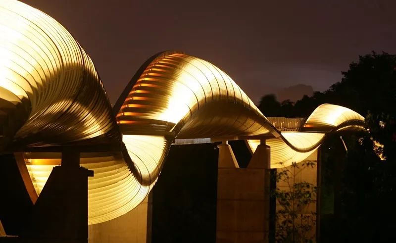 2010年启用,螺旋线人行桥位于新加坡河上游地段,连接新加坡城市既有CBD和新的滨海地区。设计概念是将桥体弯曲,形成一个拱形,目的是为了使桥身流畅地连接河道两侧的人行大道。