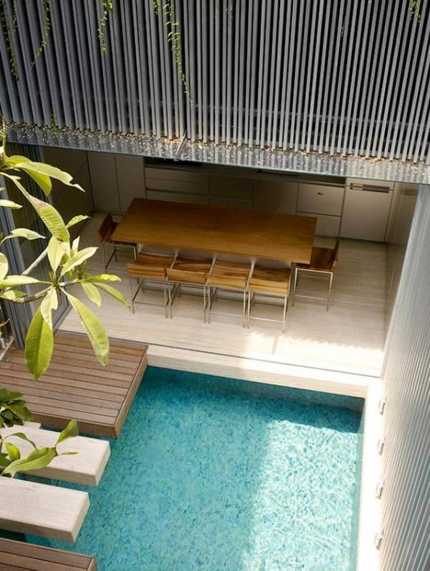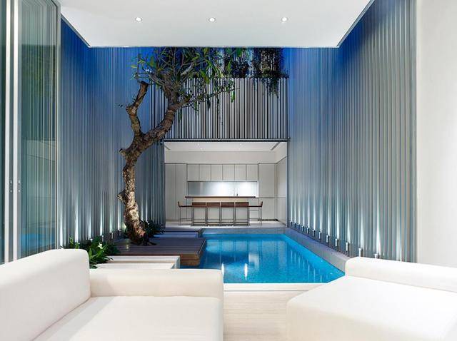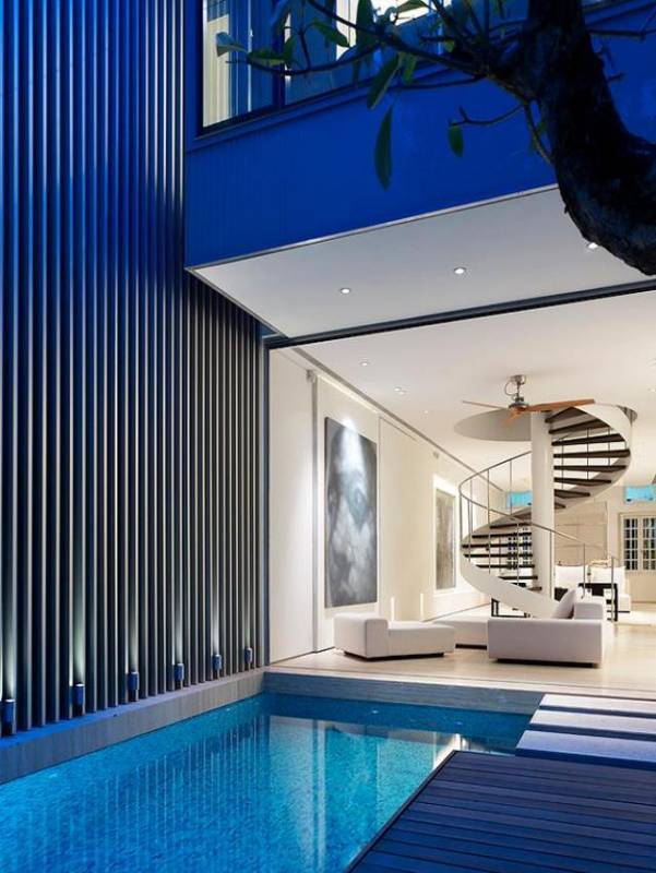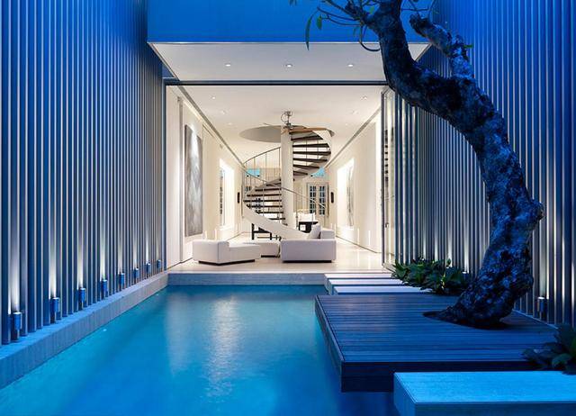 一楼采用了可直接通向游泳池的柔性玻璃墙。房子的主要部分被室外游泳池和素馨花花园隔开。当玻璃隔断的两侧打开时,第一层变成一个大的无缝空间。事实证明,该方案是一种提高空间灵活性的方法。一楼不仅是休息室和用餐区,还是放松休闲并坐在池畔的理想场所。在二楼创建一个多样化的空间的意图增加了巨大的价值,并吸引了这种规模的财产。电视和音乐设备隐藏在墙上的凹槽中,当不使用大型艺术品时,这些凹槽会隐藏起来。这重申了空间连续性的概念。照明可由集成计算机控制,该计算机可用于设置房屋内的照明氛围。房屋主要部分的整个第二层已分配给带浴室的主卧室/书房。该物业的外立面外观精髓被带入该区域,因为传统的商店橱窗以及不寻常的舷窗都成为这里的焦点,照亮并包围新的生活空间。房屋的后部(服务区)可容纳厨房空间,化妆间,女佣的房间和屋顶露台。钢制螺旋楼梯连接这些空间。内部庭院将房屋的两部分分开,但整个方案采用相同的材料选择以确保整体。
