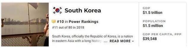 前十最后一个国家是韩国,也是2019年度全球最强大国家TOP10中唯一一个有变化的国家。
