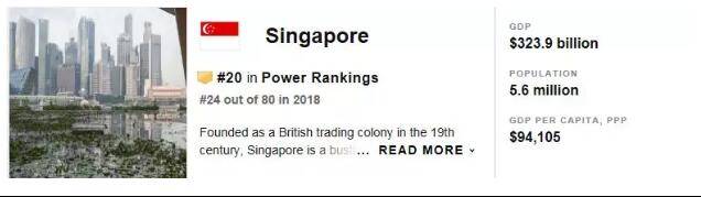 新加坡排名第二十,较去年上升四个名次,这个拥有近560万人口的国家,人均GDP为94105美元。