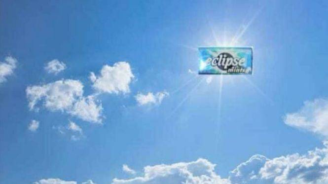 日食(solar eclipse)和易极薄荷糖(Eclipse mints)的英文表达是一样的,都是“Eclipse”。那么,网友们绝不闲着!脑洞大开!把薄荷糖放在天上!
