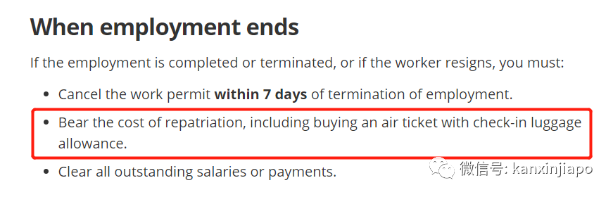 对于外籍雇员,MOM规定,如果合约完成或终止或者工人辞职,雇主必须: 终止雇佣后7天内取消雇员的工作许可证。 承担雇员的遣返费用,包括购买带托运行李限额的机票。 支付所有未结算薪金。