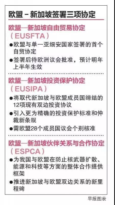 该协议将在明年年初欧洲议会投票通过之后正式得以生效,新加坡方面预计届时84%的出口货物可以免税进入欧洲。而协定生效的三至五年内,所有进口到欧盟的新加坡货品能完全免关税;双边贸易也会进一步扩大,预计五年可增长10%。