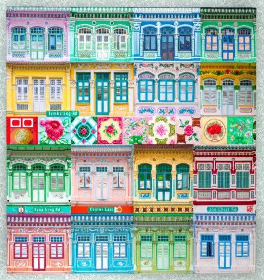 但不同于“道外“的是,新加坡的店屋融入了土生华人(Peranakan)文化的元素。它是华人/印度人与本土人文化交融的产物,体现为巴洛克般的繁复装饰和浓艳色彩。放眼望去,只见枣红,明黄,翠绿,湖蓝,太白……这些出现在儿童绘本上的色彩是狮城街头的平常。从以下两个以店屋为原型的艺术品可见一斑。