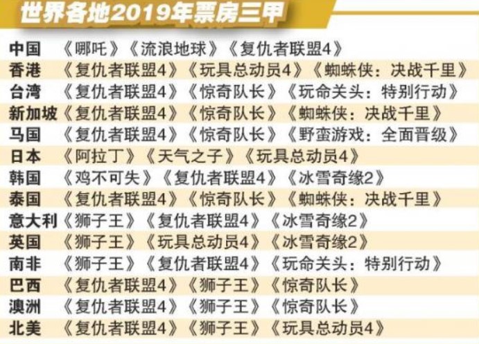 唯一入榜的华人电影是中国动画《哪吒之魔童降世》,此片也是中国的冠军片。“中国十大”入榜的还包括张涵予的《中国机长》与吴京的《流浪地球》等片。