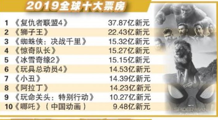 《狮子王》也是“2019全球十大票房”的亚军片,今年这股动画真人改编是热潮,《阿拉丁》就排第八,《Pokemon 神探皮卡丘》列17。