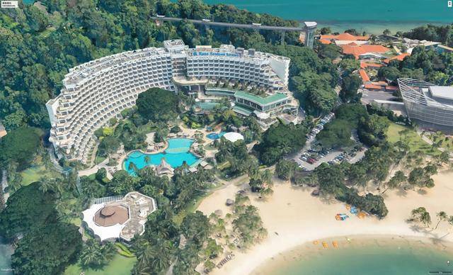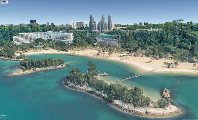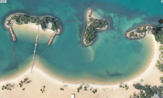 圣淘沙的西乐索海滩,从地图上看都是如此之美。只可惜我并没有带任何的无人机,所以此等角度的美景,我只能在网上用无人机视角截图给大家看了。