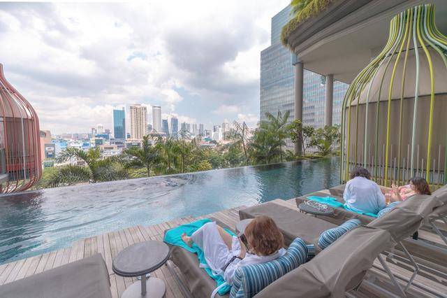 在这类酒店入住后必须要干的事情是什么呢?当然就是游泳了。酒店的5层是一个很大的无边泳池,旁边有很多供人休息的“鸟笼”。在这种无边泳池中游泳,是不是能满足你的一切遐想。
