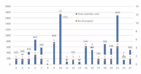 在2019年启动的52个项目中,约有20个(或38%)位于黄金地段第9、10和11区;另有8个项目(15%)位于黄金地段第15区、安珀路(Amber Road)及迈耶路(Meyer Road)东岸住宅一带。明年,37个项目中有15个(约41%)位于第9、第10和第11区,只有两个位于第15区(见图表)。
