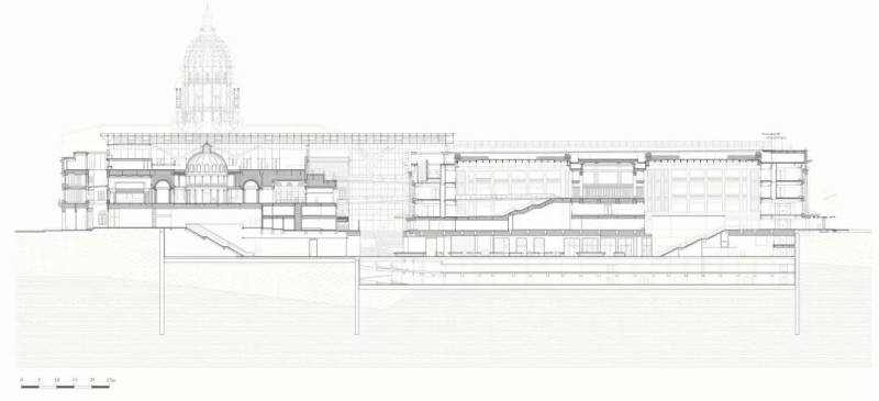 在两座建筑的地下扩建了地下室,包括连通的游客接待大厅、技术设备区、艺术品收藏和维护区,并在原市政大厦下增加了两层地下停车场。为了实现这一设计要求,首先对原有结构进行支护后,在市政大厦的外立面下打微孔桩,之后周圈浇筑防水的混凝土围护墙,再在两栋建筑的室内打桩,以满足荷载要求。