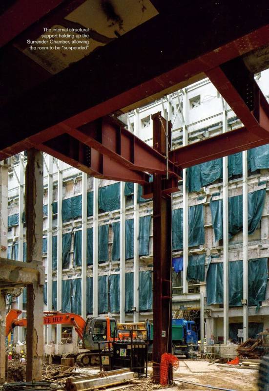 图/这张施工照片本来解释的是市政大厦内最重要的会议大厅在基础开挖过程中被临时的钢结构整体托起,以保留完整的空间和内装修。但是通过照片也可以看到其实室内的楼板被切割断了,基本上只留一个外立面,这样既为基础工程的施工创造了足够的空间,也为上文中的‘厚墙’技术提供了可能,但是历史建筑的价值不可避免地受到了损失。来源:Connetions- History and Architecture, City Hall and Supreme Court