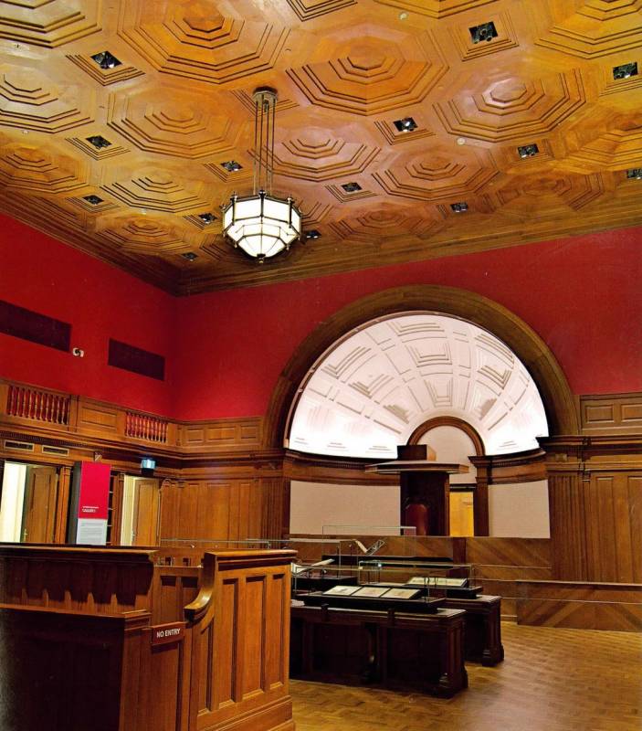前最高法院的入口大厅和四间法庭的室内天花上采用了这种格网状的天花图案。为了将新的展览照明、应急照明和消防喷淋管线隐藏在天花板的上部,这些木质天花吊顶被小心地拆下来,进行残损检查。如有必要,则更换新的板材;如果可以重新使用,则进行必要的除虫、防腐处理后放回原位。照明和喷淋系统的位置都被详细地设计过,并在颜色上尽量和木质的色泽接近。