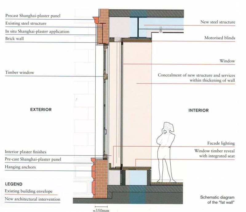 在外立面室内一侧的‘厚墙’系统:原有外立面的窗在进行必要的修缮后保持原状,所有新功能的增加都是在原窗后面的第二层新窗上,包括使用防爆安全玻璃、使用保温隔热隔音性能优质的新材质窗框、新增电动百叶窗,外立面照明系统等等。室内一侧的墙体尤其‘厚重’,其实是在里面‘藏’了必要的结构和各类电力、通风系统。
