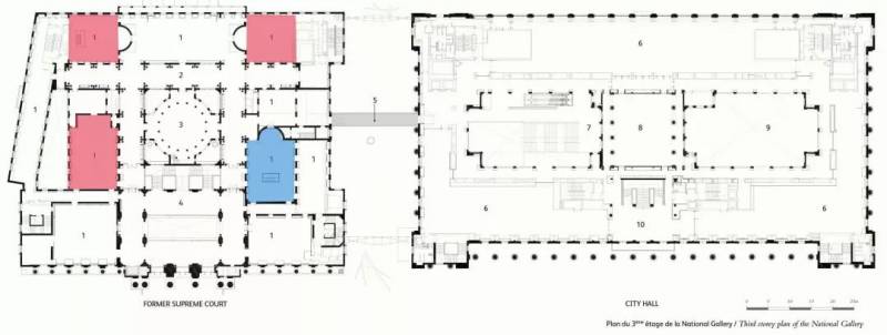 图/国家美术馆三层平面图,左侧为最高法院,右侧为市政大厦。填色区域为最高法院内的四间法庭,其中蓝色为最重要的大法官法庭,配有私人的电梯和办公室,现在均改为艺术展室。两座建筑通过空中连廊连接 。来源:Studio Milou