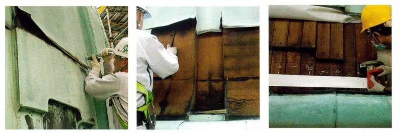 这个65米高的拱顶是建立在2300吨的钢结构上,钢结构之上是一层混凝土薄壳,再用木质‘瓦片’做出造型,最后再附上黄铜皮。为了检查黄铜覆面下木构件的糟朽情况,就必须把每一片黄铜都揭除。每片黄铜和木瓦都被编号,以备某一片需要取走进行修复后归位。糟朽的木瓦被原有材质、尺寸的新木瓦进行替换;破损的黄铜片如果破损较小,则用一小片新黄铜贴合在原有铜片的底部,手工凿平后与原有铜皮进行焊接;如果破损、锈蚀面积较大,则把破损的部分剪掉,再取一片新铜片与原铜片焊接;或者干脆完全更换一块新铜片。原有黄铜片在漫长岁月中已氧化为铜绿色,新更换的铜片进行人工氧化处理后,与原有铜片颜色无异。