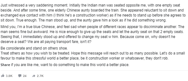 她将照片发到网上,并为这种充满歧视的行为感到难过,并在Facebook上发出质问:“为什么他不能坐着?我们都付了车资对吗?”同时她也希望传达“做人要以己度人,为他人考虑”的信息,让世界变得更好,更和谐。