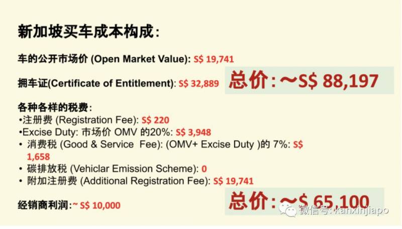 如果你觉得这就是费用的绝大多数,那就too young, too simple 了。这里还有让人眼花缭乱的各种税。首先是固定的一笔注册费220新币,一笔excise duty,是政府对特殊商品,比如烟酒车所征收的额外消费税,是总价的20%,还有一笔所有商品都会征收的消费税,是市场价和exciseduty总和的7%。接下来为了响应全球气候变化,倡导节能减排,政府对新车征收碳排放税,幸好我们这款toyota比较中规中矩,不用额外交税,最后是一笔昂贵的附加注册费,如果车收完税,最后就是dealer经销商的利润了,这个我没有经验,不好说具体是多少,但那么贵的场地费,各种手续办下来,大概是88新币的花费,用现在的汇率缓过来就是61000美金。